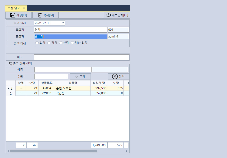 - A.入庫先と入庫者を入力後に入庫商品を選択して保存(F1)を押して保存すると入庫が処理されます。